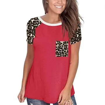 Topstype Womens Short Sleeve Tops Crew Neck Casual Leopard Shirts with Pocket Tee