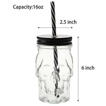 TOPZEA 6 Pack Mason Jars Mugs, 16 oz Glass Skull Mason Drinking Mugs Tumbler Cup with Straws Old Fashioned Jar Drinking Glasses Heavy Base for Beverage, Brandy, Liquor, Jello