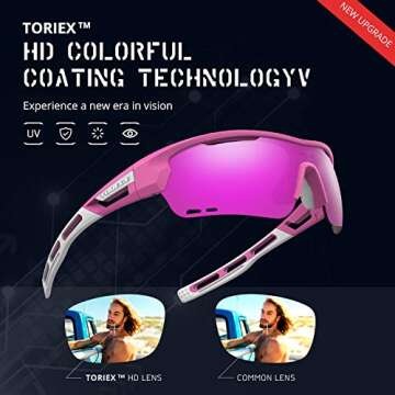 Show more Introducing the **TOREGE Polarized Sports Sunglasses TR33 Storm Chaser**, the ultimate eyewear companion for athletes and outdoor enthusiasts alike! Designed to combine style and function, these sunglasses feature a vibrant **matte pink and white frame** coupled with **purple interchangeable lenses**, making them not just a practical choice but also a fashion statement. Perfect for a wide range of activities such as cycling, running, fishing, golf, and driving, these sunglasses provide superior protection and visual clarity, ensuring you look great while being active.