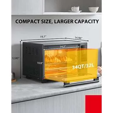 It has an extra-large capacity of 34QT/32L, fitting 8 slices of bread or a whole chicken.