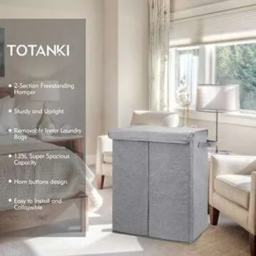 TOTANKI Double Laundry Basket with Removable Bags, 135L 2 Section Large laundry Hamper with Lid, Collapsible Clothes Baske with Handles, Divided Laundry Basket for Bedroom, College, Bathroom (Grey)