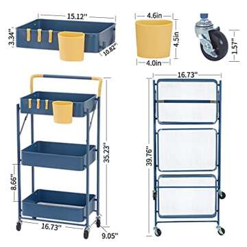 totolot 3-Tier Collapsible Rolling Utility Cart with Lockable Caster Wheels, Metal Storage Cart for Classroom, Office, Bathroom, Blue Yellow