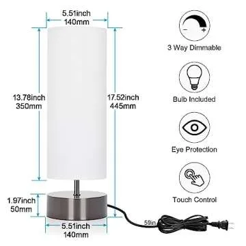 Show moreIlluminate your living space with the **Touch Control Table Lamp**, a perfect blend of minimalist design and functional utility. This stunning lamp stands at a height of **17.52 inches** with a diameter of **5.51 inches**, making it an eye-catching accessory for any room. With its sleek black nickel base and elegant white open-top cylinder shade, it effortlessly complements various decor styles. The lamp is designed to create a warm and inviting atmosphere, perfect for unwinding after a long day.