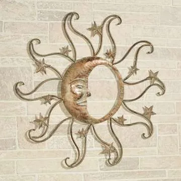 Show more Discover the unique charm of the Touch of Class Sun and Moon Face Metal Wall Art, a stunning masterpiece designed to enhance your living space with its exquisite southwestern style. This exclusive piece is not just decor; it's a conversation starter that effortlessly combines artistry and elegance. Measuring 30 inches in diameter and 1 inch deep, this large metal wall art showcases an intricately handcrafted design featuring a crescent moon nestled within sun rays, sprinkled with decorative stars. Its hand-painted tarnished gold finish adds a touch of warmth and sophistication, creating a captivating focal point in any setting.