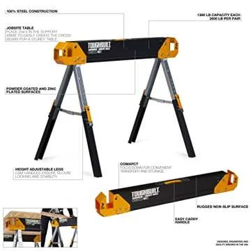 Show moreIf you’re on the lookout for a reliable and heavy-duty equipment that can support your toughest projects, look no further than the ToughBuilt Folding Sawhorse/Jobsite Table (TB-C600). Constructed from 100% high-grade steel, this sawhorse is specifically designed to handle the rigors of demanding jobs without breaking a sweat. With an impressive 1300 lb. capacity when used individually, and a staggering 2600 lb. capacity per pair, you’ll be fully equipped for any task that comes your way. It’s not just robust; it’s built to adapt to your working needs, making it perfect for professionals and DIY enthusiasts alike.