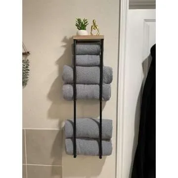 Towel Racks for Bathroom, 2 Tier Wall Towel Holder with Wood Shelf, Metal Wall Towel Rack Mounted Towel Storage for Small Bathroom (Black