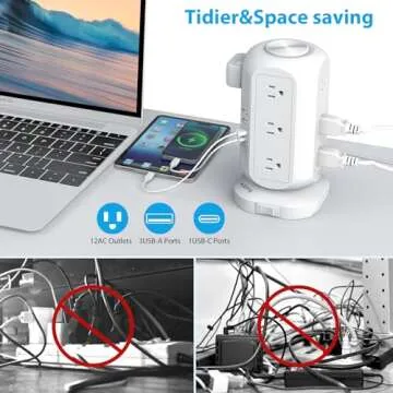 Show more Welcome to a world of convenience with the 16 IN 1 Power Strip with USB! This innovative device is more than just a power source; it's a masterful blend of style and functionality. Designed to cater to the needs of modern households and offices, this power strip features 12 AC outlets and 4 USB charging ports (including 1 USB-C), allowing you to charge up to 16 devices simultaneously without the hassle of cluttered cables. Its flat plug design is merely 0.35 inches thick, enabling you to discreetly tuck it behind your furniture or appliances, ensuring a clean and organized workspace.