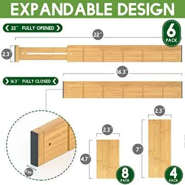 Toydoooco Bamboo Drawer Dividers with 12 Inserts,16.3-22inches,Expandable Kitchen Drawer Organizer,Adjustable Drawer Separators for Bedroom Bathroom Dresser 6 Pack