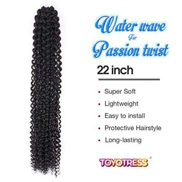 Show more Transform your look with TOYOTRESS Passion Twist Hair, the ultimate solution for stylish, voluminous locks. These stunning 22-inch synthetic braiding hair extensions in dark brown offer a beautiful water wave texture that mimics natural curls, making them perfect for any occasion. Each package includes six packs, providing plenty of hair to create the perfect style, whether it's for a special event or everyday wear. Made with high-quality materials, TOYOTRESS ensures that these crochet braids are not only easy to install but also comfortable to wear all day long.