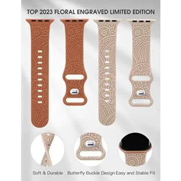 Show moreElevate your Apple Watch experience with the TOYOUTHS 2 Pack Boho Engraved Bands, designed to blend functionality and style seamlessly. These bands feature a unique Henna Boho Flowers and Leaf Plants Print Engraved Design that stands out with exquisite craftsmanship. Specifically crafted for compatibility with Apple Watch bands of sizes 42mm, 41mm, 40mm, 38mm, 46mm, 45mm, 44mm, and 49mm, they come in a set of two to give you the flexibility to mix and match according to your outfit or mood. Made from premium soft silicone, these bands not only boast an advanced laser carving technique that results in intricate floral and plant patterns, but also ensure durability and comfort throughout daily wear.