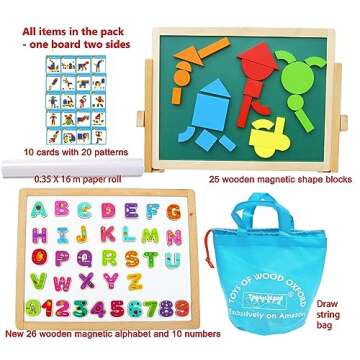 - Complete Set of Accessories: Comes with 25 magnetic wooden shapes, 26 alphabet letters, 10 numbers, and 10 double-sided cards for creativity and learning.