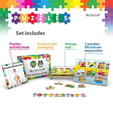 TOYVENTIVE Wooden Peg Toddler Puzzles with Organizer Rack & Activity Book