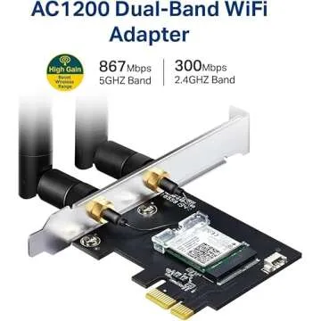Show more Upgrade your desktop experience with this revolutionary WiFi & Bluetooth PCI-E Card. Designed to deliver super-fast speed and reliable performance, this card offers you the best connectivity solutions available. With AC1200 WiFi speeds – reaching up to 867 Mbps on the 5GHz band and 300 Mbps on the 2.4GHz band – you'll enjoy seamless streaming, gaming, and browsing. The integration of Bluetooth 4.2 technology further enhances your experience, boasting a speed increase of up to 2.5 times and 10 times more packet capacity than its predecessor, Bluetooth 4.0.