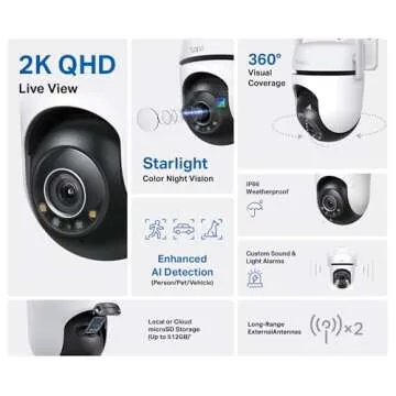 Show more Introducing the TP-Link Tapo 2K QHD Outdoor Pan/Tilt Wi-Fi Security Camera, a revolutionary device designed to offer you unparalleled peace of mind. With its **full-color night vision** capabilities that extend up to **98 ft**, you can ensure your property is monitored even in the darkest conditions. The camera’s advanced **360° visual coverage** allows for comprehensive surveillance with a **2K QHD live view** that captures every detail, making it a perfect addition to your home security arsenal.