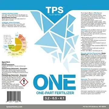 Show moreIntroducing the TPS-One Liquid Plant Nutrient, your all-in-one solution designed to take your gardening game to the next level. This one-part complete fertilizer seamlessly transitions your plants from the vegetative phase all the way to the blooming stage, eliminating the hassle of mixing multiple nutrients. With TPS-One, you can expect robust growth and powerful blooms thanks to its carefully engineered formula that enhances nutrient absorption for healthier and more vibrant plants.