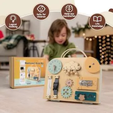 TQJ Montessori Busy Board Toddler for Toddlers with Drawing Board Baby Busy Board Wooden Sensory Board Montessori Toys Preschool Education Learning Fine Motor Life Thinking and Hands-on Skill