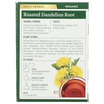 Show moreDiscover the rich and satisfying flavor of Traditional Medicinals Roasted Dandelion Root Tea. This unique tea, packaged with 16 carefully sourced bags, offers a delightful alternative to traditional caffeinated beverages while promoting optimal liver health. Known for its ability to support digestion and increase bile production, this organic tea has gained recognition for its health benefits and taste. Many users have noted its exceptional smoothness, with some even preferring it to coffee! The roasting process enhances the earthy, robust flavor while eliminating the bitterness often found in similar alternatives. Enjoy it hot or cold – it's a wonderful addition to your daily routine!