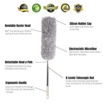 Show more Introducing a revolutionary cleaning tool designed for those hard-to-reach places in your home! This extendable duster offers unparalleled versatility, making cleaning not merely a chore, but a delightful task. Made by a trusted brand known for its commitment to quality, this duster features an extendable pole that can easily reach up to 12 feet, allowing you to effortlessly clean ceiling fans, corners, and high shelves. Say goodbye to balancing on chairs or stretching to reach dusty surfaces! Its lightweight design ensures that you can handle it with ease, while its durable construction guarantees longevity.