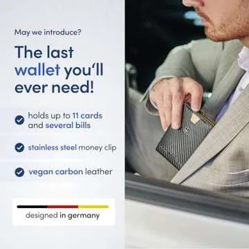 Show more Introducing the TRAVANDO Mens Slim Wallet with Money Clip AUSTIN, a perfect blend of sophistication and functionality designed for the modern gentleman. This wallet is crafted from durable carbon fiber, making it not only lightweight but also incredibly resilient against everyday wear and tear. With its RFID blocking technology, your sensitive information is well-guarded against unwanted electronic scanning, giving you peace of mind wherever you go. The compact bifold design includes a convenient outside notch that allows for effortless access to your most-used cards, while the integrated metal money clip ensures your cash stays securely in place without the bulk of a traditional wallet. Measuring at a sleek 4.5" x 3.1" x 0.6", this wallet fits seamlessly in your pocket, making it an ideal accessory for both casual and formal occasions.