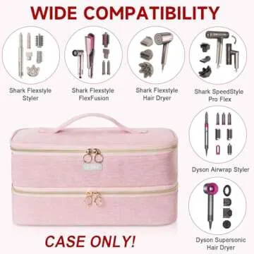 Show moreIntroducing the ultimate Travel Carrying Case designed with a perfect blend of functionality and style, tailored specifically for your Shark Flexstyle Styler, SpeedStyle, and FlexFusion hair dryers, along with compatibility for the esteemed Dyson Airwrap Styler and Supersonic hair dryer. With generous dimensions of 13.5'' x 6.25'' x 6.5'', this case features a large capacity design that allows you to store your entire hair styling collection, including all attachments, hairpins, and essential care products, without the stress of overcrowding. Enjoy organized luxury on your travels without compromising on space!