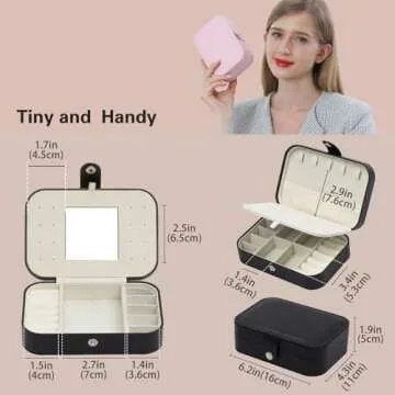 Show moreIntroducing the Travel Jewelry Box, an elegantly designed jewelry organizer that redefines convenience and style. Measuring at a compact size of 6.2 x 4.3 x 1.9 inches, this portable case may be small, but it boasts an impressive capacity to keep your treasured pieces organized and untangled. With a double-layer structure, this jewelry box provides well-thought-out compartments: 5 hooks for necklaces at the top, a mirror in the middle for quick styling checks, followed by 16 holes for your earrings and studs, 6 dedicated ring holes at the bottom, and 6 additional compartments for brooches, lipsticks, watches, and more. The clever design makes it a must-have travel companion, ensuring your jewelry stays secure and accessible wherever you go.
