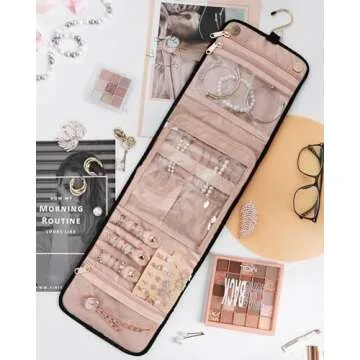 Travel Jewelry Organizer Case Jewelry Travel Pouch for Rings Storage, Earrings, Necklaces, Bracelets, Brooches, Foldable Travel Jewelry Roll Hanging Jewelry Bag Roll (Black, Small)