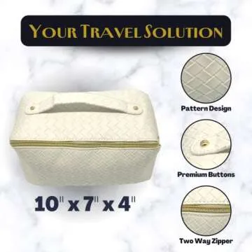 Show moreIntroducing our elegant Travel Makeup Bag – the ultimate travel companion for those who love to stay organized in style! Whether you are jet-setting around the globe or heading out for a simple weekend getaway, this chic cosmetic bag is designed to cater to your every need. Crafted from high-quality white leather, its spacious dimensions of 10x7x4in offer plenty of room for your makeup necessities, brushes, skincare products, and much more. Its sophisticated appearance makes it a perfect accessory that enhances any travel outfit.
