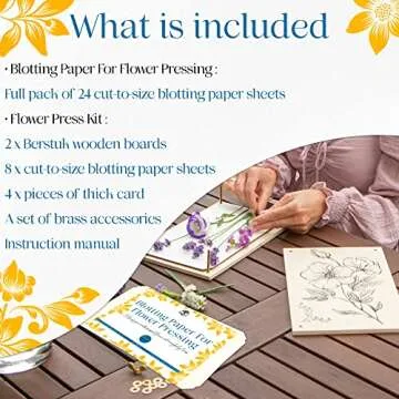 The kit includes a portable flower press, high-quality blotting paper, a detailed manual, and a complimentary eBook, "The Pressed Flower Companion".