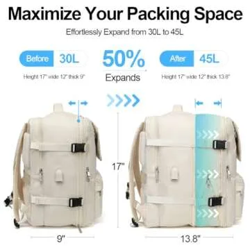 TRAVELHEART Travel Backpack for Women and Men - Large Expandable 45L with Shoe Compartment - Carry On Backpack for Airplanes - Flight Approved - Personal Item Size, White