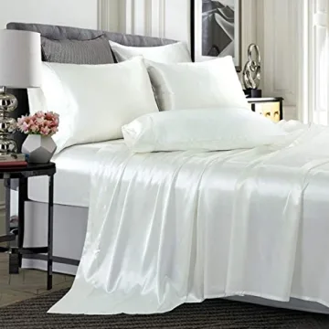 Show more Experience ultimate luxury with the TREELY 6 Piece Queen Size Satin Sheet Set. Crafted from the finest satin, this exquisite ivory white sheet set combines elegance and functionality, transforming your bedtime into an indulgent escape. Each set includes a fitted sheet, flat sheet, and four pillowcases, all designed to fit mattresses up to 15 inches deep, ensuring a snug and secure fit. The rich, silky texture not only enhances the aesthetic appeal of your bedroom but is also gentle on your skin and hair, reducing friction and preventing tangles, breakage, and skin damage.