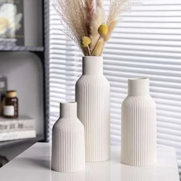 Show more Introducing the exquisite White Ceramic Vase Set, designed to elevate any space with its modern charm and artistic flair. This set includes three vases of varying sizes: the largest measures 9.8*3.3*3.3 inches, the medium is 7.8*3.3*3.3 inches, and the smallest is 5.9*2.9*2.9 inches. Each vase is adorned with vertical striped textures, creating a unique visual depth that captures the eye and compliments any decor style.