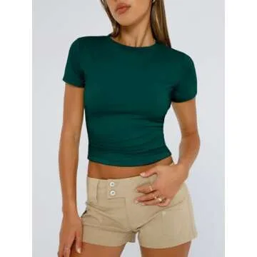 Trendy Queen Womens Basic T Shirts Summer 2025 Scoop Neck Short Sleeve Crop Tops Slim Fit Tees Y2k Clothing DarkGreen S