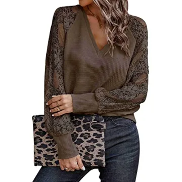 Trendy Queen Womens Fall Fashion 2023 V Neck Puff Lace Long Sleeve Shirts Crochet Hollow Out Elegant Blouses Casual Bobo Clothes Crochet Tunic Tops Coffee