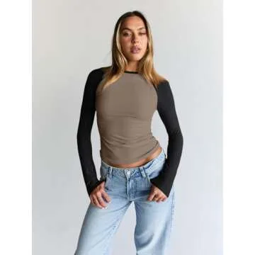 Trendy Queen Womens Long Sleeve Shirts 2024 Fall Fashion Outfits Clothes Slim Fitted Basic Tee Going Out Crop Brown Tops Cute Y2k Teen Girl Color Block T Tshirts