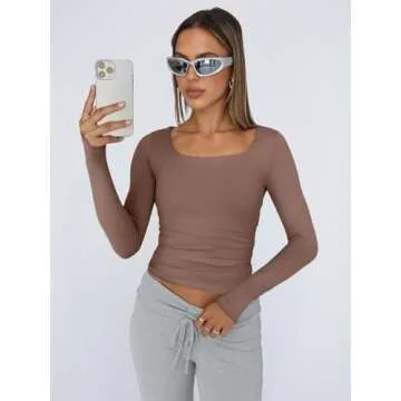 Trendy Queen Womens Long Sleeve Shirts Crop Tops Square Neck Going Out Basics Tees Y2K Winter Clothes 2025 Coffee Grey XS