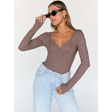 Trendy Queen Womens Tops Trendy Fashion Clothes Going Out Long Sleeve Shirts V Neck Basic Y2K Cute Shirt Slim Fitted Corset Coffee Grey L