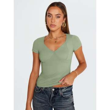 Trendy Queen Womens V Neck T-Shirts Going Out Tops Short Sleeve Slim Fit Basic Y2K Clothes 2025