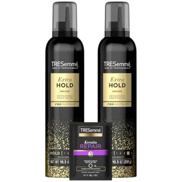 Show moreIntroducing the TRESemmé Extra Hold Mousse 2-Pack, coupled with the Keratin Repair Hair Mask, your ultimate hair care solution for achieving beautiful, manageable styles effortlessly. This remarkable set includes two full-size bottles of TRESemmé Extra Hold Mousse (10.5 oz each) and one travel-size Keratin Repair Mask (1.5 oz), crafted to suit all hair types. The mousse provides an impeccable hold for every occasion while the mask rejuvenates and revitalizes hair health. Whether you have thinning hair or luscious locks, enjoy the flexibility and volume you’ve always wanted without the worry of stiff or crunchy strands.