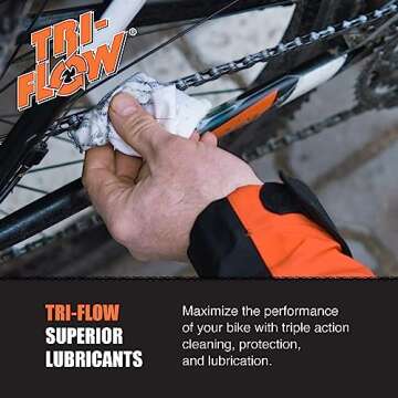 What sets Tri-Flow apart is its unique blend of lubricating ingredients that include a proprietary PFTE (Polytetrafluoroethylene) formula. This advanced technology not only reduces friction but also provides enhanced rust and corrosion protection, making it ideal for everything from bicycles to machinery and automotive applications. Whether you're addressing squeaky hinges, sticky gears or providing maintenance for your beloved bike, Tri-Flow TF21010 is versatile and ready to tackle any lubrication task.