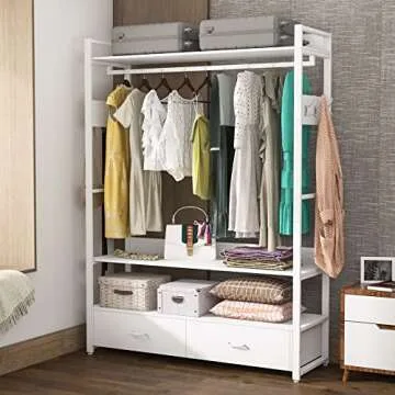 Show more Introducing your new favorite storage solution that combines elegance with unmatched functionality! This incredible freestanding closet organizer system is ingeniously crafted with a heavy-duty metal frame paired with thick particle boards. This ensures stability and sturdiness that can hold up to an impressive weight capacity of 400 lb. This makes it not just a temporary fix, but a long-term closet storage organizer that you can rely on.