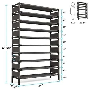 Measured at an overall size of 34”W x 10.7”D x 63.58”H with each shelf offering 6.3” of height, this shoe rack is incredibly spacious yet compact enough to fit into a variety of spaces, including homes, apartments, and dorm rooms. It's not only designed for regular shoes but can also accommodate high boots or larger men's shoes by removing any layer as needed. The option to customize its shape into two lower shoe racks adds to its versatility.