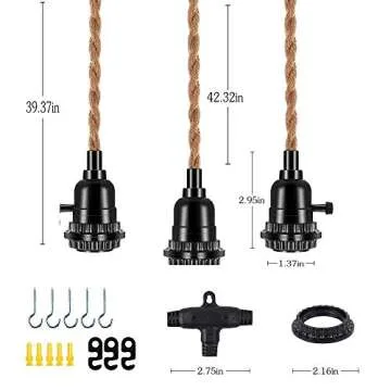 Show moreIlluminate your space with the beautifully crafted Triple Pendant Light Kit, featuring a vintage aesthetic that complements both traditional and modern industrial designs. This exceptional lighting fixture is not just a source of illumination, but a stylish statement piece, bringing warmth to any room. Each cord is meticulously designed with a 27-foot twisted hemp rope, providing an ample length for versatile installation options—from draping around rafters to hanging gracefully over furniture. With individual switches for each socket, this kit allows you to control the ambiance with ease, making it perfect for any occasion.