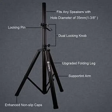 This sturdy, non-slip construction supports even the heaviest of speakers, with a loading capacity of up to 143 lbs. Its foldable design ensures effortless storage and portability, making it perfect for both home use and outdoor events. With a hole diameter fit of 35mm (1-3/8”), this stand accommodates a wide range of speaker models, making it a versatile addition to your audio setup.