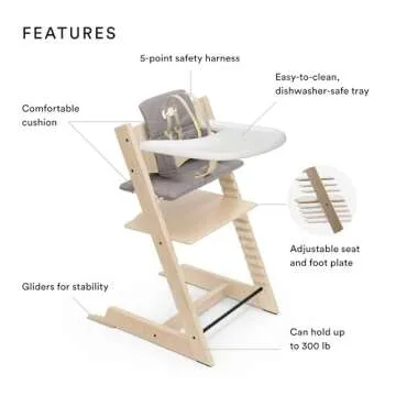 Show more Introducing the Tripp Trapp High Chair, an exceptional blend of style and functionality perfect for your growing child. Designed by renowned Scandinavian brand Stokke, this high chair is crafted from sustainable beech wood and comes in a stunning natural finish complemented by an elegant Icon Grey cushion. With a unique design that allows your child to sit at the dining table from an early age, the Tripp Trapp caters to children from 6 months to adulthood, thanks to its adjustable seat and footrest. This remarkable versatility makes it not only a high chair but a lifelong investment that adapts seamlessly to your child’s needs. The inclusion of the Stokke tray enhances its functionality, making mealtimes a hassle-free experience.