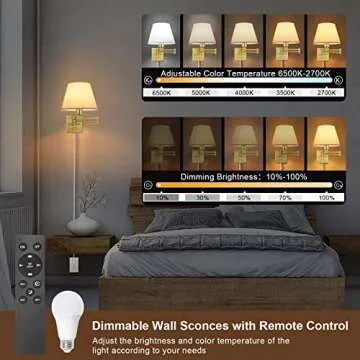 TRLIFE Dimmable Wall Sconce, Remote Control Dimming 10-100% and Adjustable Color Temperature 2700K-6500K Brushed Brass Swing Arm Wall Lights with Plug in Cord, 9.4" Medium White Shade(2 Pack, 2 Bulbs)
