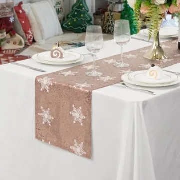 Show more Introducing the **TRLYC Christmas Table Runner**, a stunning addition crafted to elevate your holiday celebrations. Measuring a generous **12"x72"**, this gorgeous piece features a mesmerizing **rose gold** hue adorned with exquisite **snowflake sequins**. Designed not only for style but also for functionality, this runner is the perfect way to highlight your dining table during the festive season. Whether it's for a cozy family dinner or a grand holiday party, this runner is guaranteed to make a statement with its **high-density 3MM sequins** over satin mesh, ensuring a chic look that shines bright and captures the spirit of Christmas.