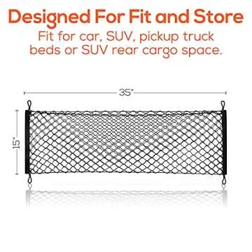 Show more Introducing the Trobo Trunk Storage Organizer, your ultimate solution for car clutter! This heavy-duty elastic mesh storage net bag is specifically designed to accommodate all your storage needs, whether you're driving a car, SUV, van, truck, or Jeep. Measuring a generous 35” x 15”, it’s fully adjustable, allowing it to fit snugly in almost any trunk or backseat space. Crafted from premium quality materials, this trunk organizer guarantees lasting durability and a neat, organized space for all your essentials.