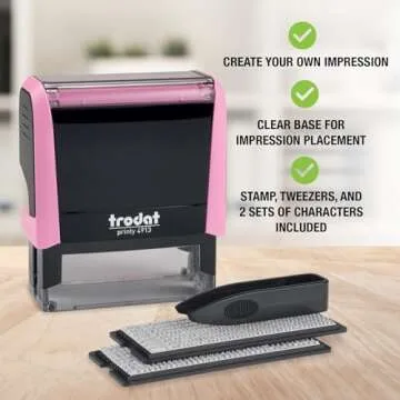 Show moreUnleash your creativity with the Trodat Printy 4913 Self Inking DIY Stamp Kit in a delightful pastel pink hue! This versatile and user-friendly kit empowers you to create personalized stamps tailored to your needs, be it a name stamp, address stamp, or a custom business stamp. The kit includes everything necessary to craft your own unique stamp – featuring an ideal impression size of 7/8” x 2-3/8”. Whether you're a teacher marking papers, a business owner stamping returns, or simply someone who loves crafting, this kit is designed for you to express yourself in an efficient and stylish way. The self-inking feature ensures you enjoy hassle-free stamping every time! Less
