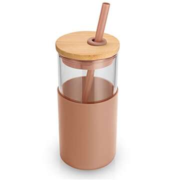 tronco 16 oz Glass Tumbler with straw and Bamboo lid,iced coffee cup tumbler with Silicone Protective Sleeve - BPA Free