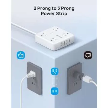 Show more Introducing the ultimate solution for all your power needs, the 2 Prong Power Strip! This innovative power strip is designed to enhance your living space by converting a single 2 prong wall socket into not just four 3 prong outlets but also four fast-charging USB ports, including one USB C charger. No more worrying about running out of outlets—this power strip is a lifesaver, especially in older homes with limited two-hole outlets. Experience the convenience of having multiple devices charged simultaneously without the clutter of cables everywhere.